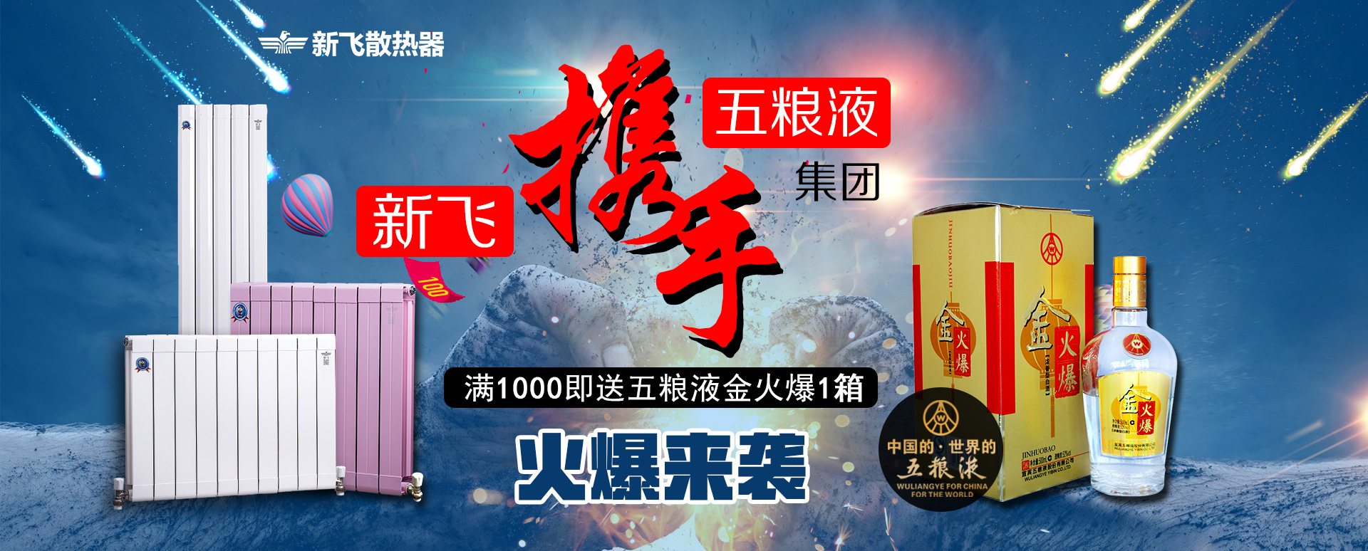 新飛散熱器攜手四川五糧液股份有限公司,強強聯合瘋狂大促銷。感恩回饋新老客戶,在活動期間,凡在全國600余家新飛散熱器店內,購買新飛暖氣滿1000元均送五糧液金火爆系列白酒一箱(6瓶),活動詳情見全國各大新飛散熱器專賣店解釋。