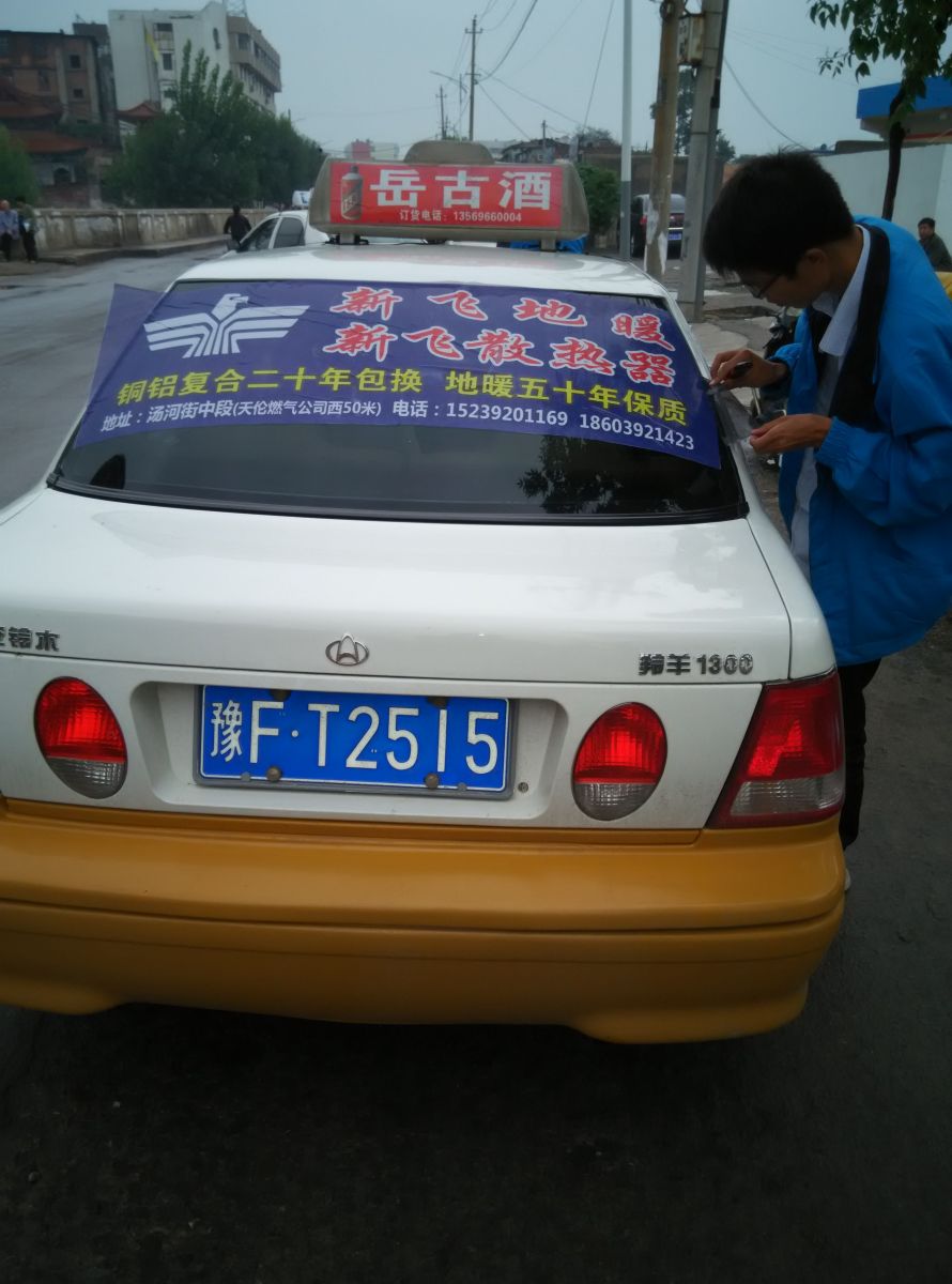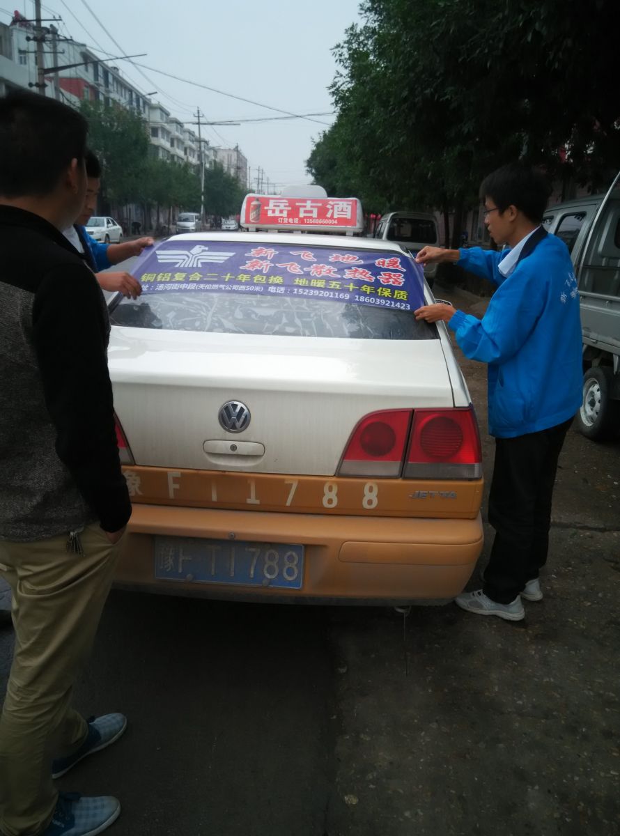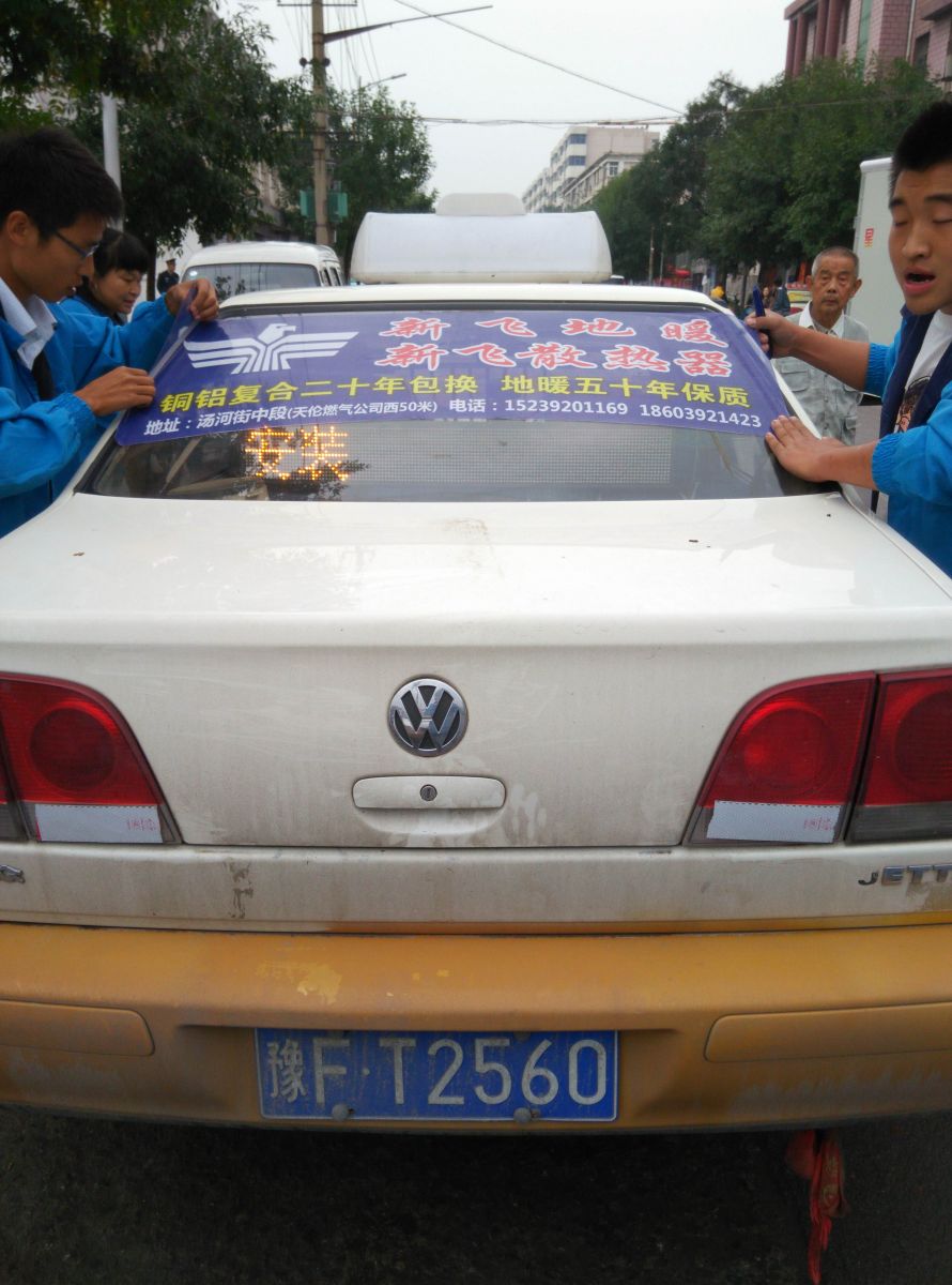 為響應(yīng)新鄉(xiāng)市新飛散熱器有限公司十一優(yōu)惠政策,鶴壁代理商王經(jīng)理在全市舉行團(tuán)購(gòu)簽購(gòu)會(huì),買新飛散熱器抽新飛冰箱大獎(jiǎng),氣氛熱烈,轟動(dòng)全城!為配合公司宣傳,特做百輛出租車廣告。